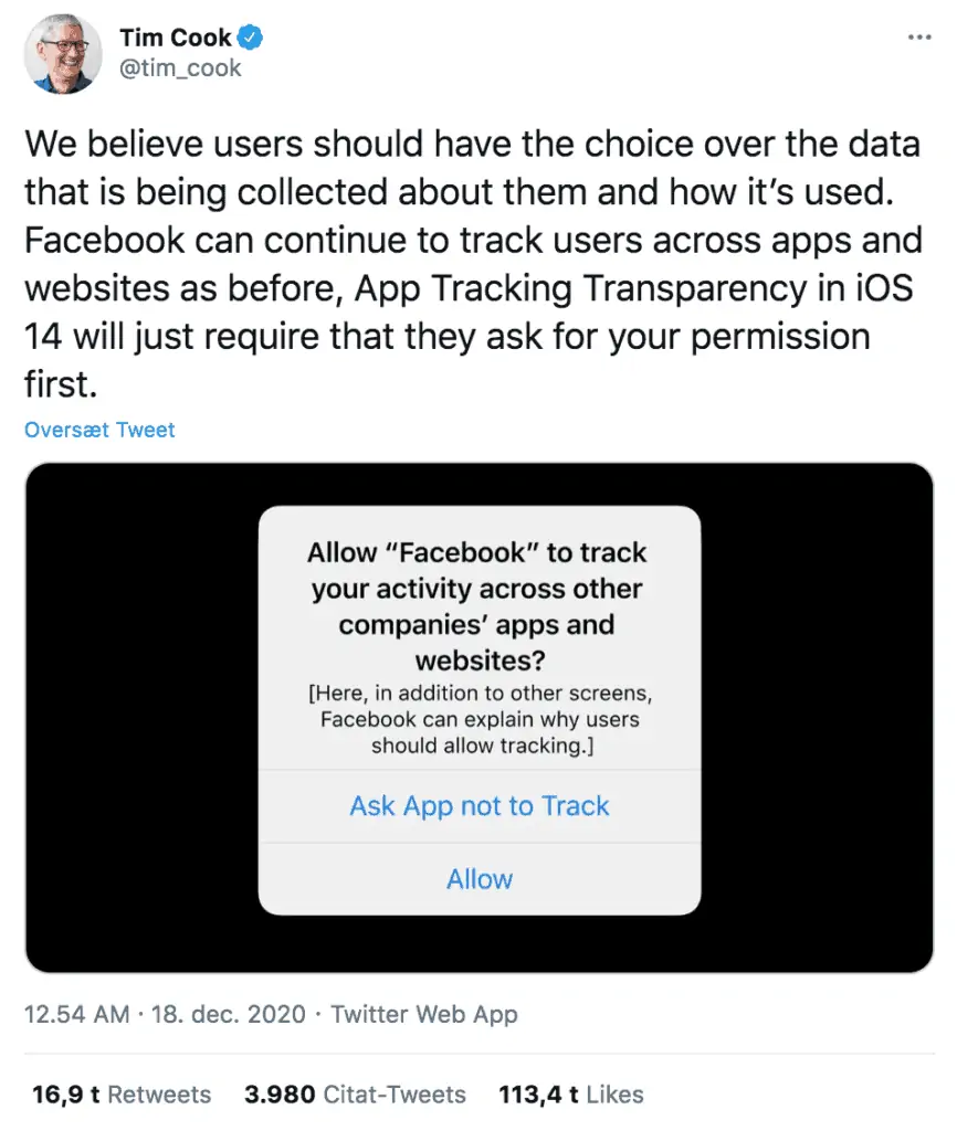Facebook har dog især været ude med riven og mener ligefrem, at Apples opdatering er med til at skade små forretninger, som bruger Facebook til at annoncere og vokse. Til dette skriver Apples CEO, Tim Cook, følgende på Twitter: