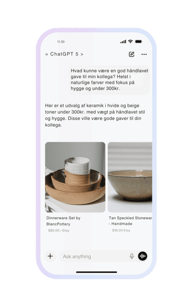 - Vi går fra søgning til køb i ét flow. ChatGPT viser relevante produkter på baggrund af naturlige spørgsmål.